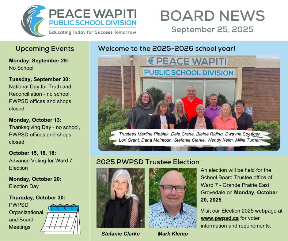 The Peace Wapiti Public School Division's Board News highlights topics discussed during public board meetings.
